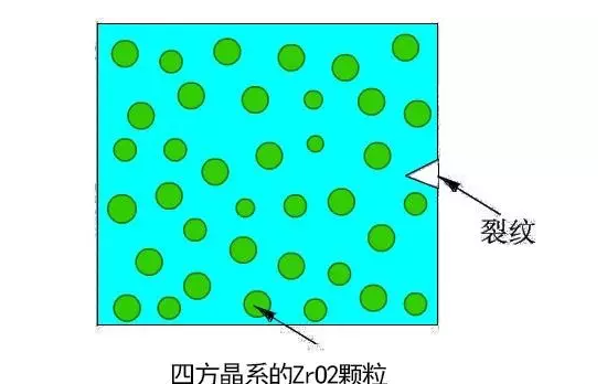 氧化鋯中四方相向單斜相的轉(zhuǎn)變可通過應(yīng)力誘發(fā)產(chǎn)生。當(dāng)材料受到外界拉應(yīng)力時,基體對ZrO2的壓抑作用得到松弛,ZrO2顆粒即發(fā)生四方相到單斜相的轉(zhuǎn)變,這種相變將吸收能量而使裂紋尖端的應(yīng)力場松弛,增加裂紋擴(kuò)展阻力,從而大幅度提高陶瓷材料的韌性。