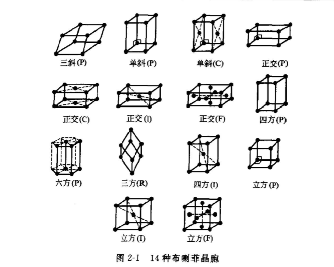 晶胞不僅反映了晶體結構的周期性,也反映了晶體的宏觀對稱性,同樣由于晶格周期性的限制,所以晶胞的取法是有限的。圖2-1給出了14種布喇菲晶胞點陣,表2-2給出了7個晶系、14種布喇菲晶胞點陣的特性及所屬的對稱群。