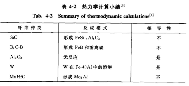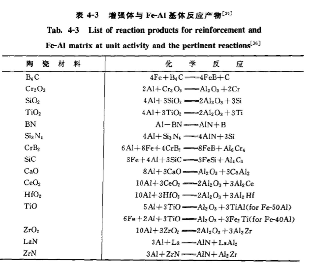 由表4-2可以看出,F(xiàn)eAI與A2O具有較好的適配性能,兩者之間無界面相形成。AAYK. MISRAZ在1990年也分析預(yù)測了以FeAl金屬間化合物為基體,陶瓷為增強(qiáng)體復(fù)合村料的熱動力學(xué)可能反應(yīng)產(chǎn)物),分析結(jié)果見表4-3。上述結(jié)果對復(fù)合材料的設(shè)計也是非常重要的。