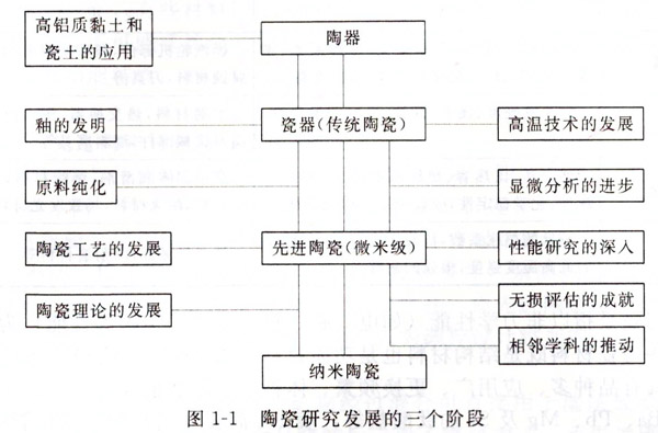 總的來說,陶瓷是一種既古老而又年輕的_:程材料,陶瓷材料的發(fā)展經(jīng)歷了從陶瓷發(fā)曩裂瓷器.從傳統(tǒng)陶瓷發(fā)展到先進(jìn)陶瓷,從先進(jìn)陶瓷發(fā)展到納米陶瓷三次重大飛躍(見圖I-I),而這三次飛躍只是中華文明史的一個縮影。
