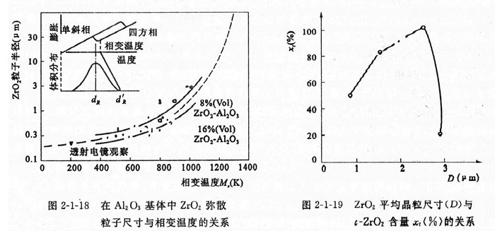 氧化鋯的顆粒尺寸,對(duì)相變?cè)鲰g是有影響的。實(shí)踐表明,氧化鋯相變的條件應(yīng)是單位體積的氧化鋯顆粒數(shù)的總能量相當(dāng)于氧化鋯相變引起的界面能變化。氧化鋯在陶瓷基體中的相變溫度是氧化鋯顆粒尺寸和化學(xué)組分的函數(shù),圖2-1-18表明了1696 (VoI) 氧化鋯-A1209和8~6( V01)氧化鋯 -Alz 03系統(tǒng)中的氧化鋯相變溫度與其顆粒度之間的關(guān)系。由此看出,在冷卻過程中顆粒大者優(yōu)先由四方相轉(zhuǎn)變?yōu)閱涡毕唷<囱趸啅浬⒂谔沾苫w中的相變溫度M.是隨著氧化鋯顆粒的減小而偏低的。當(dāng)氧化鋯顆粒小到足以使相變溫度偏移到常溫下,即t-氧化鋯 -直保持到常溫,則陶瓷基體中就儲(chǔ)存了相變彈性壓應(yīng)變能(,-丁),只有當(dāng)基體受到了適量的外加張應(yīng)力,其對(duì)氧化鋯的束縛得以解除,才能發(fā)生四方相氧化鋯向單斜相氧化鋯轉(zhuǎn)化。如果氧化鋯顆粒尺寸較大,則其相變溫度處于常溫以上,那么制品冷卻至室溫之前,t-氧化鋯就已自發(fā)地轉(zhuǎn)化為m-氧化鋯。而且氧化鋯品粒尺寸對(duì)t-氧化鋯含量的影響也是很重要的。如圖2-1-19所示。從圖中看出,最高的t-氧化鋯的含量只處于很窄的晶粒尺寸范圍內(nèi)。